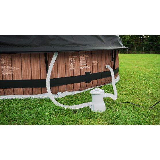 Baseny ramowe EXIT Toys zawsze zawierają w zestawie pasującą pompę filtrującą. Jeśli nadal wolałbyś większą pompę filtrującą, to oczywiście możesz ją zainstalować samodzielnie. Im mocniejsza pompa filtrująca, tym czystsza będzie Twoja woda. Należy wciąć pod uwagę, że pompa filtrująca ma 32-milimetrowe złącze.