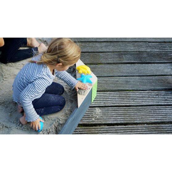 Drewniane piaskownice Aksent marki EXIT Toys są łatwe w montażu i bardzo wytrzymałe. Otwory wstępnie wywiercone są w narożnikach i zabezpieczone metalowymi złączkami, dzięki czemu piaskownica jest bardzo stabilna. Narożniki pomalowano na wyrazisty zielony kolor, który w połączeniu z szarym kolorem drewna nadaje piaskownicom ładny i nowoczesny wygląd.