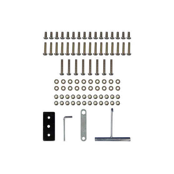 Complete screw set, including spanner, allen key and spring hook, suitable for rectangular InTerra and Supreme ground level trampolines of EXIT Toys with dimensions of 214 x 366 centimetres.