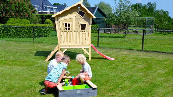 Drewniane domki do zabawy EXIT nie tylko zapewniają dzieciom świetną zabawę w ogrodzie, ale tworzą prawdziwy raj! Dzieci wychodzą ze swojego małego domku zjeżdżalnią i przechodzą prosto do stołu piknikowego, aby wziąć coś do picia. Następnie szybko biegną do piaskownicy, aby pobawić się w piasku i wodzie przy pięknej, słonecznej pogodzie.